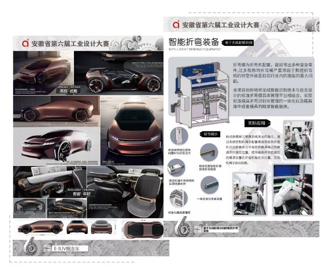 最終,來自奇瑞汽車的E-IUV概念車(概念設(shè)計)與安徽聯(lián)盟模具工業(yè)有限公司的基于無線射頻識別的智能折彎裝備( 實物產(chǎn)品)榮獲本次大賽金獎,從設(shè)計理念、產(chǎn)品外形、先進技術(shù)在產(chǎn)品中的應(yīng)用以及解決行業(yè)痛點等關(guān)鍵問題上,以上作品在行業(yè)中均處于領(lǐng)先水平。同時,來自順榮股份、三只松鼠、美的冰箱、中車龐巴迪(蕪湖)、安徽工程大學(xué)、安徽工業(yè)大學(xué)等企業(yè)、高校投稿作品也在本次大賽中取得了優(yōu)異的成績。